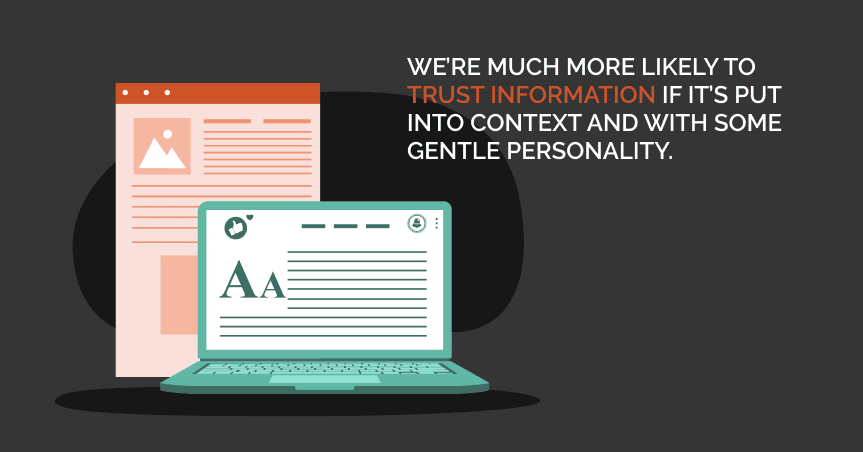 For a lot of people, myself included, have a hard time listening to someone if the conversation feels robotic. We’re much more likely to trust information if it’s put into context and with some gentle personality.
